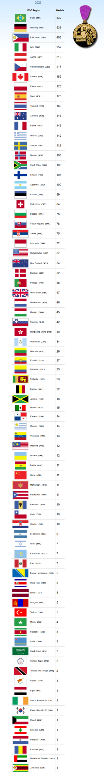 Concluímos o ano de 2025 com um total de 832 medalhas, um aumento significativo em relação aos países que ficaram em 2º lugar Alemanha com 533 medalhas e 3º lugar as Filipinas com 408 medalhas, grande marco para o Brasil como o país que mais desenvolveu o TIRO PRÁTICO perante as outras nações.