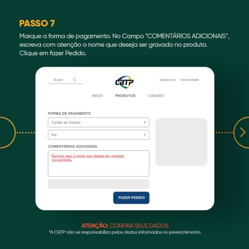 A CBTP não se responsabiliza pelos dados informados pelo cliente durante o preenchimento da compra. Todos os pedidos personalizados não tem a possibilidade de troca/devolução. Por isso, confira todos as informações antes de finalizar sua compra.